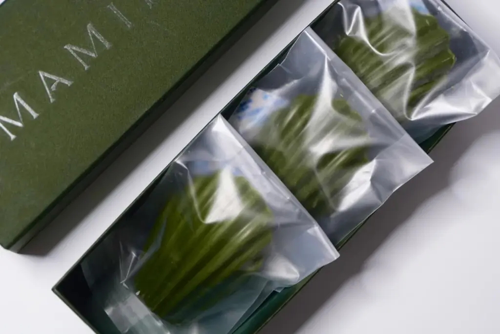 MAMIDORIマドレーヌは、着色料不使用のチョココーティング、真緑の生地、そして内部に詰められた濃厚なガナッシュが特徴の焼き菓子です。市販のマドレーヌでは表現しにくい抹茶の旨み・香りの再現を目指して開発され、抹茶の色味・風味・香りの各観点から最適と判断された抹茶を使用しています。