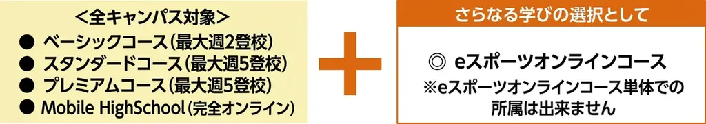 対象となる在籍コースは、ベーシックコース(最大週2登校)、スタンダードコース(最大週5登校)、プレミアムコース(最大週5登校)です。さらに、レポート学習を中心に進める選択肢であるMobile HighSchoolを選択した生徒も、自宅での学習と並行して本オンライン授業を受講できます。