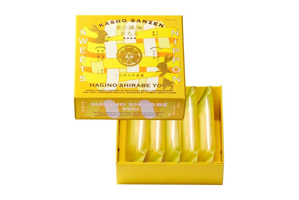 「萩の調 釉 れもん」は、白いラング・ド・シャ生地(釉のような光沢を想起させる)で市松模様のやわらかなレモンクッキーをサンドし、内部にとろりとした柑橘ソースを閉じ込めた焼き菓子です。サクサクとしたラング・ド・シャの食感とソースのとろみが一体となり、軽やかかつ爽やかな口当たりを実現しています。