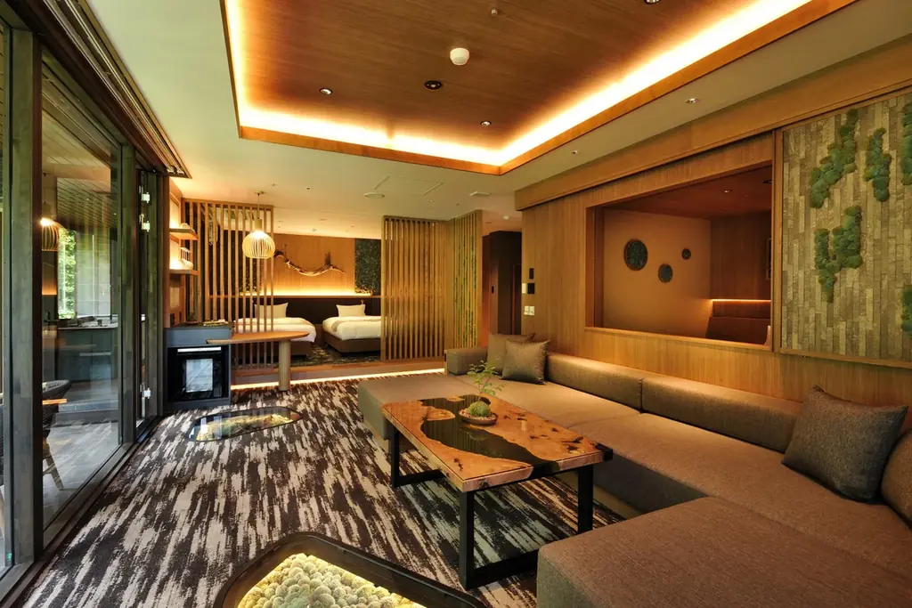 - 苔スイートルーム(1室限定):客室内の壁や床下に本物の苔を用いたインテリアを採用。苔を感じられるデザインが随所に施されています。