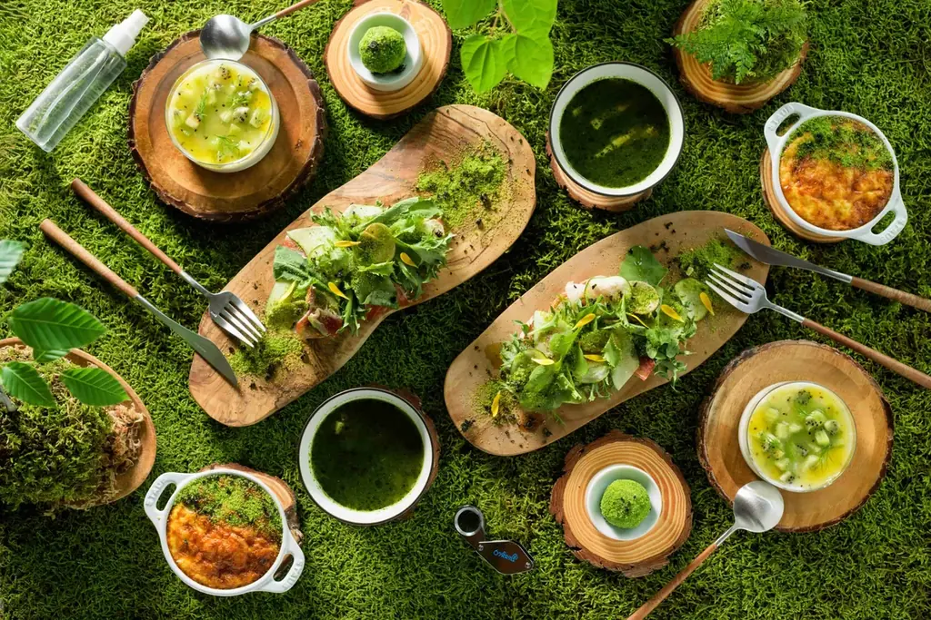 - 苔モーニング(苔スイートルーム宿泊者限定):苔らしい見た目を追求した朝食。スペシャリテのスモーブロー(北欧発祥のオープンサンド)などを用いて岩の上に苔が着生する風景を表現。