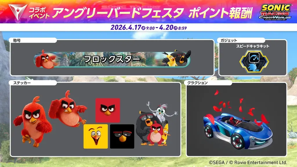 株式会社セガは、2026年4月16日(木)より『ソニックレーシング クロスワールド』の無料アップデート「レッド(「アングリーバード」シリーズ)」の配信を開始しました。今回のアップデートでは、コラボレーションキャラクターと専用マシン、そしてジュークボックスへの楽曲追加など、ゲーム内コンテンツの拡充が行われています。
