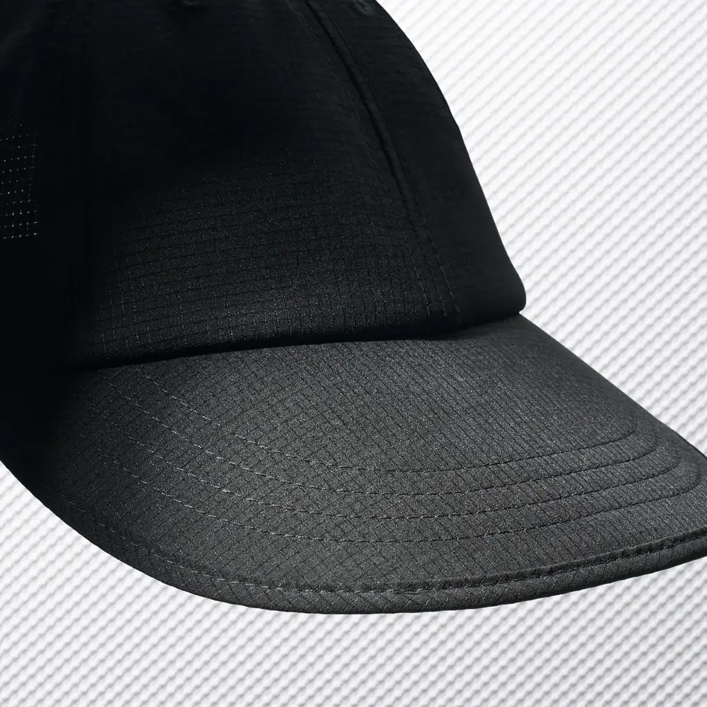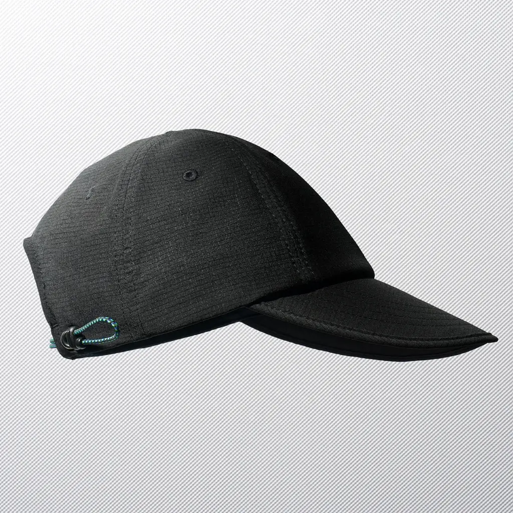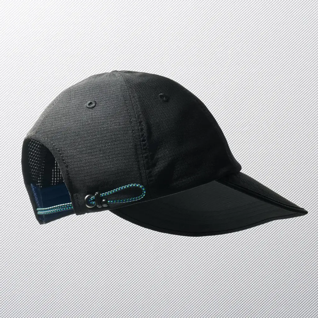 機能キャップは軽量メッシュ素材を使用し、通気性とフィット感を重視した蒸れにくい設計です。大きめのツバはUV遮蔽率90%以上で顔をしっかり守る仕様となっており、芯が柔らかく丸めて収納可能です。洗濯機で丸洗いでき、アクティブなシーンでの着用に適しています。カラーはくろ、サイズは57-59cm、価格は税抜1,817円(税込1,998円)です。