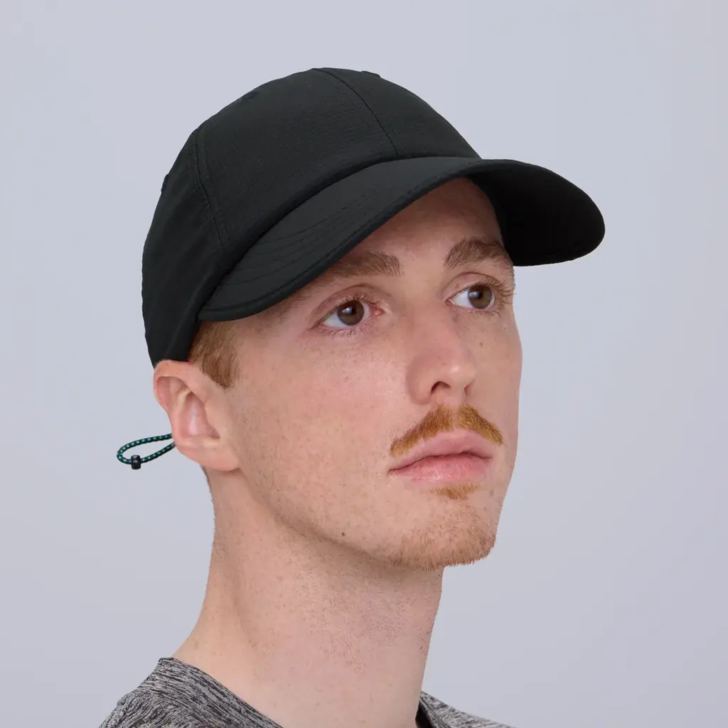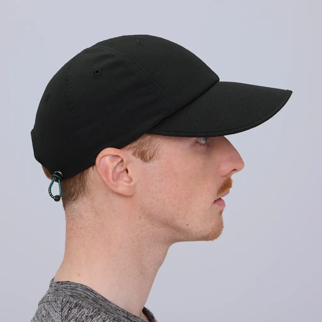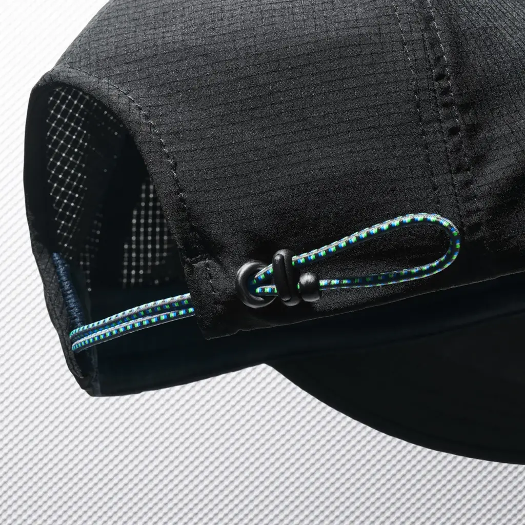 機能キャップは軽量メッシュ素材を使用し、通気性とフィット感を重視した蒸れにくい設計です。大きめのツバはUV遮蔽率90%以上で顔をしっかり守る仕様となっており、芯が柔らかく丸めて収納可能です。洗濯機で丸洗いでき、アクティブなシーンでの着用に適しています。カラーはくろ、サイズは57-59cm、価格は税抜1,817円(税込1,998円)です。