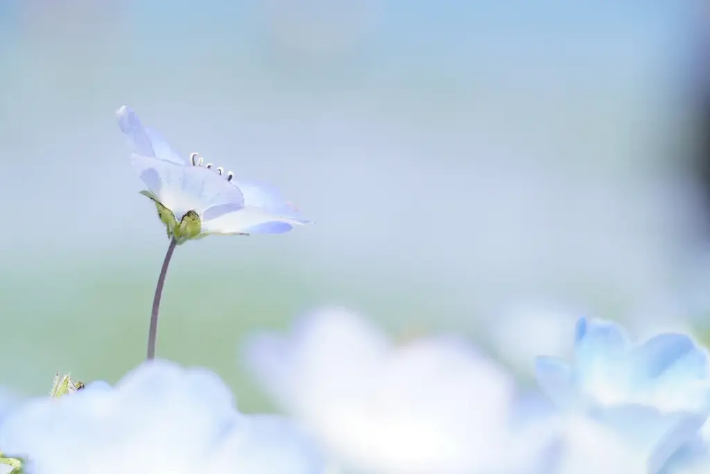 ネモフィラはムラサキ科(旧ハゼリソウ科)ネモフィラ属に属する北アメリカ原産の一年草です。高さは約10~20cm、花の直径はおよそ2~3cmの小さな青い花を多数咲かせ、群生すると丘全体が青く染まる独特の景観をつくります。