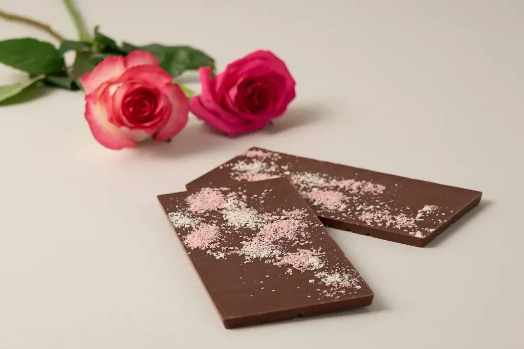 開発の背景は「定番の花束に代わる特別な驚きを届ける」ことです。一口で感じるのは、マダガスカル産カカオのベリーのような果実感と、ローズオイル由来の繊細で優雅なバラの香り。その組合せを、見た目にも花束を想起させる彩りで表現した一枚です。