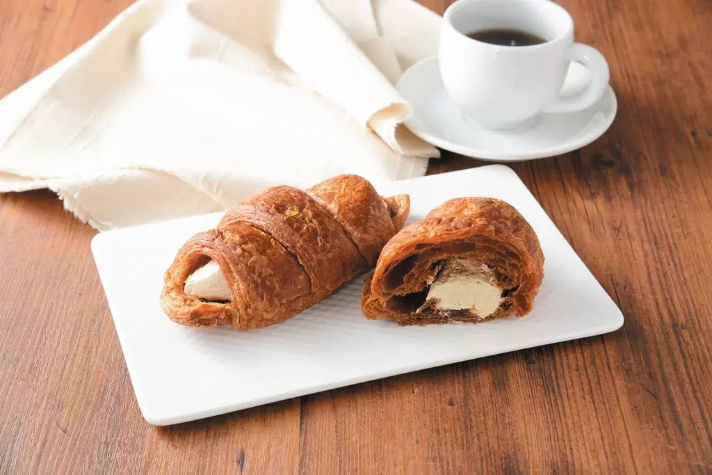 カフェラテクロワッサンは、エスプレッソのほのかな苦みを活かしたコーヒークリームと、カフェラテ風のホイップをクロワッサンにサンドした商品です。外側のサクサク感と内側のしっとりしたクリームの対比を楽しめる設計です。
