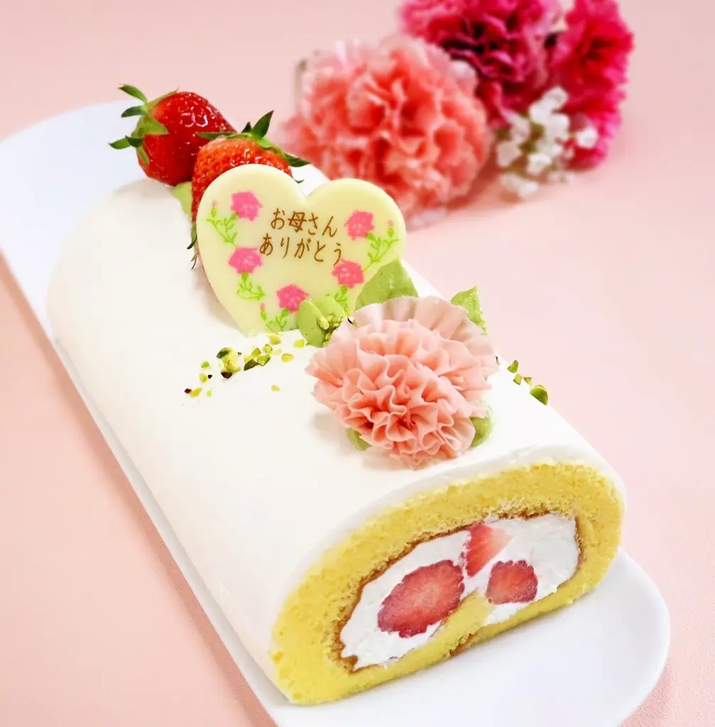 母の日のカーネーションルーロ(約18cm) 五感 2,592円 5月8日(金)〜10日(日) 5月9日(土)まで 地下1階 洋菓子売場 米粉生地で完熟苺と生クリームを巻いたルーロ