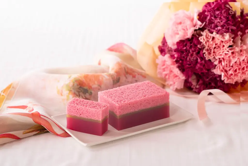 特徴:村雨と緑・紅の2色の羊羹を重ね、カーネーションをイメージした棹物です。
