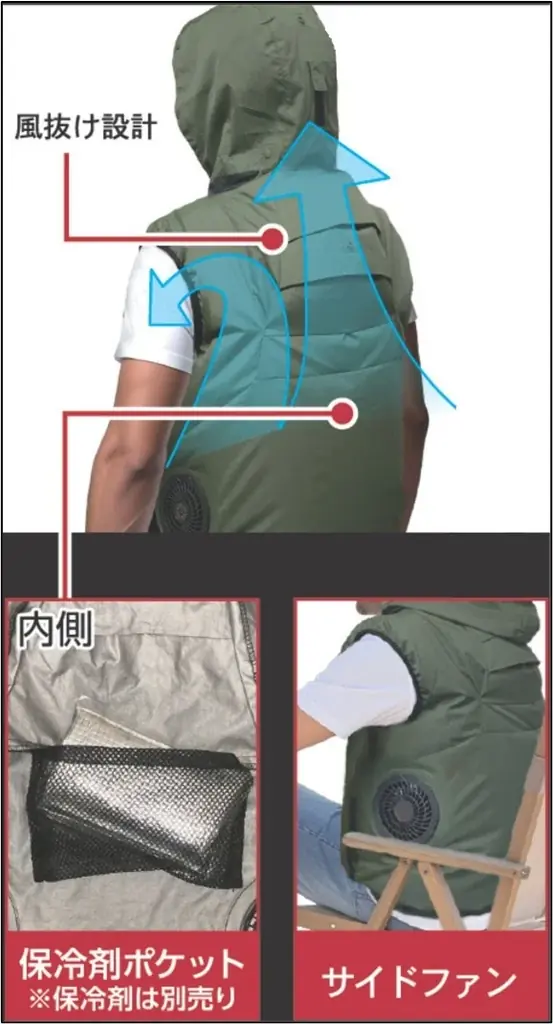 さらに、サイドファンの配置や保冷剤ポケット、バッテリーポケットなどを組み合わせることで、局所的かつ効率的な冷却を実現しています。これらの機構は作業時の動作や姿勢を妨げない設計が意図されています。
