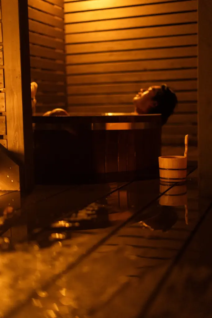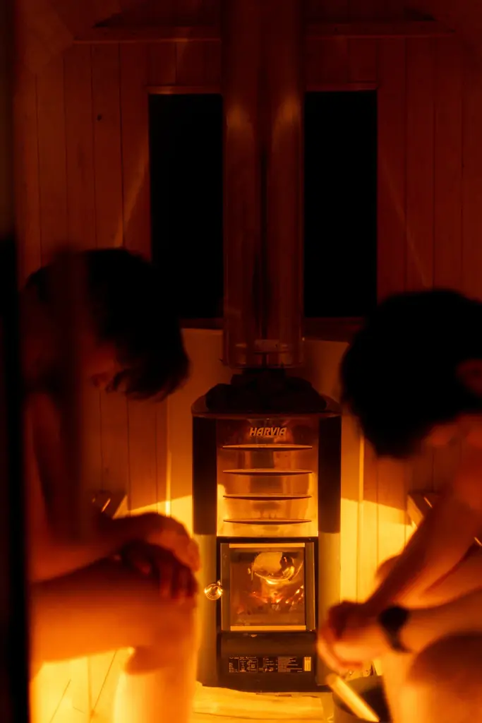 サウナ室は薪ストーブを用いたバレル型で、最低限の照明に抑えられています。視覚情報を遮断して身体感覚を開く設計となっており、最大4名でのプライベート利用が可能です。チェックイン時にスタッフによる火入れを希望することもできます。