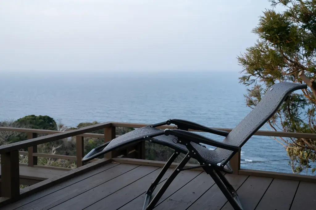 オーシャンビューの水風呂はサウナからのクールダウンまで、目の前いっぱいに海が映り込むよう設計されています。朝日のなかでの朝風呂や、サンセットに照らされる外気浴が可能です。外気浴用にロッキングチェアやインフィニティチェアも備えられています。