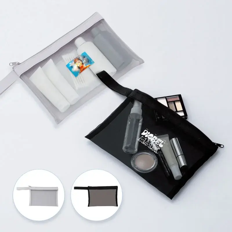 本製品は通気性に優れたメッシュ素材を採用し、中身が一目で確認できる設計を特長とするフラットポーチです。旅行やビーチ、温泉での使用を想定した実用性に加え、ストラップ付きで携帯や吊り下げ収納にも対応。個人利用はもちろん、企業のノベルティや販促品としても活用できる点が強調されています。