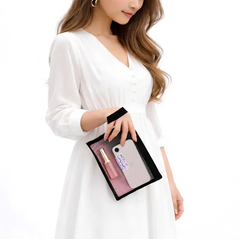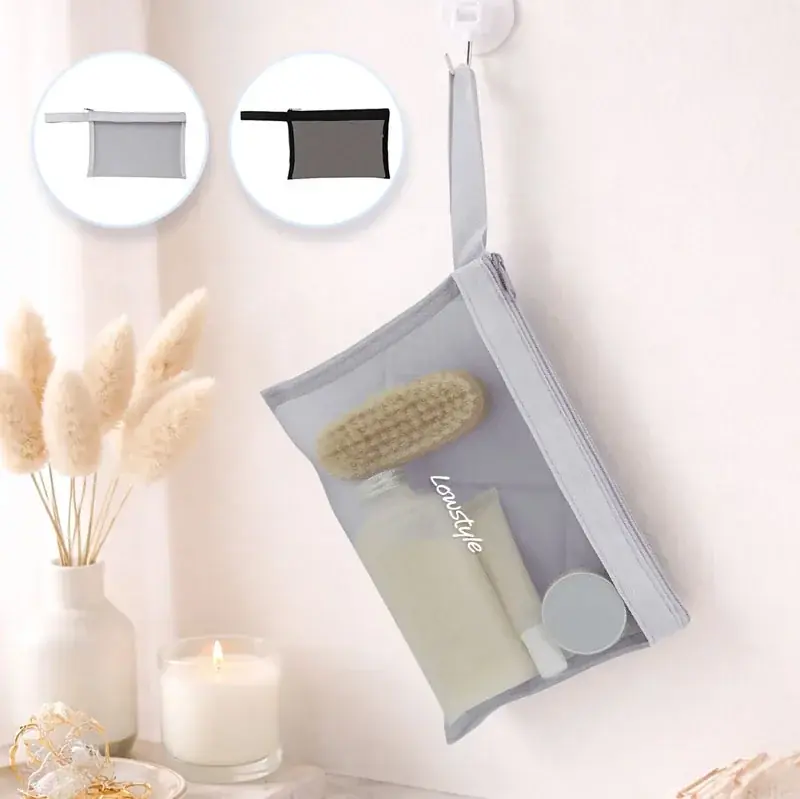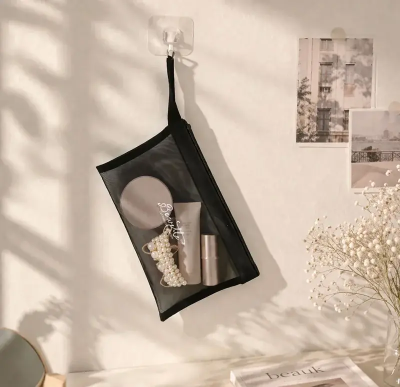 メッシュ素材により内側の中身が視認できるため、化粧品やスキンケア用品、細かな小物類の整理に適しています。旅行時のトラベルポーチとして、ビーチで濡れたものの一時収納、温泉での小物管理など、湿気や水回りを伴うシーンでも通気性を確保しやすい点が特徴です。