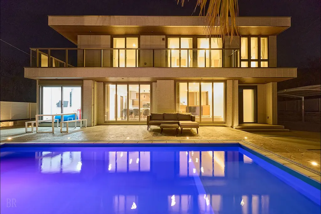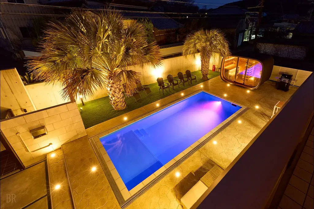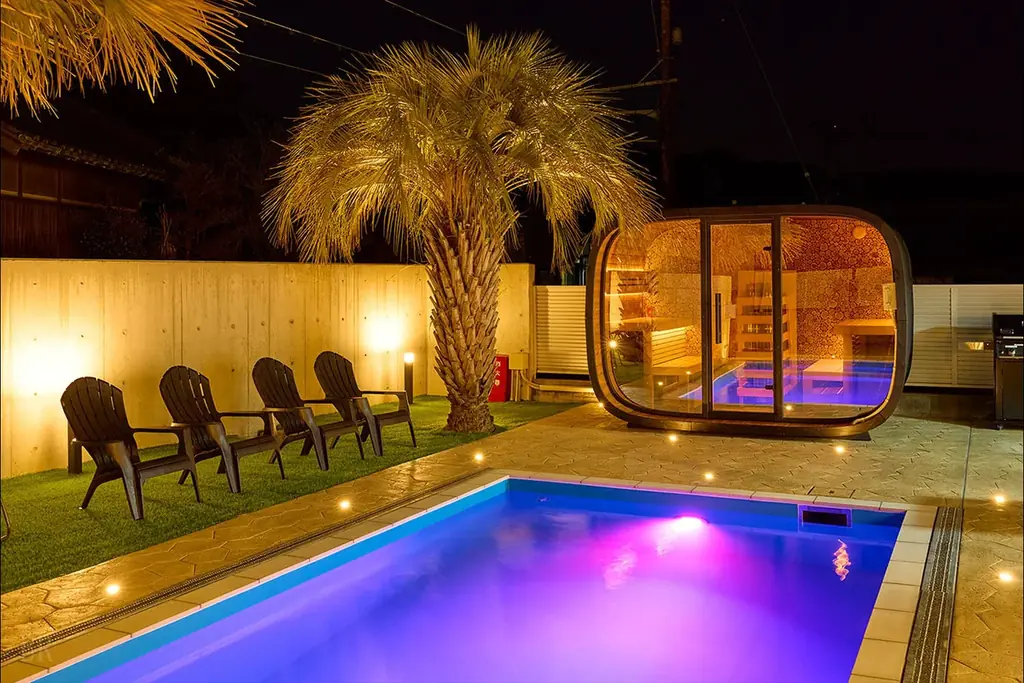 谷池荘は最大8名まで宿泊可能な一棟貸切のヴィラで、グループ旅行やファミリー利用を想定した設計です。敷地内にプールや本格的なサウナ、屋外シャワー、BBQ設備、キッズルームなどを備え、周囲を気にせず滞在できる点を特徴としています。公式サイトは https://www.awaji-pool-villa.com/ です。