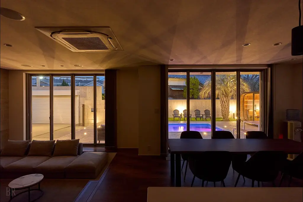 テラスにはグループでゆとりをもって楽しめる大型のプールを備えています。日中は青空の下でのリゾート気分、夜間はライトアップによるナイトプールとして時間帯に応じた雰囲気を楽しめます。
