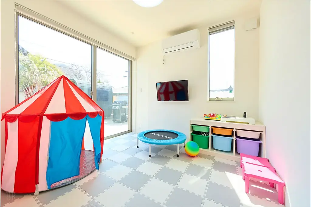 ヴィラ内にはキッズルームを設置しており、テントやトランポリンなど子どもが遊べる遊具が用意されています。天候に左右されず屋内で遊べるスペースを設けることで、小さなお子様連れの家族も滞在中に安心して過ごせます。