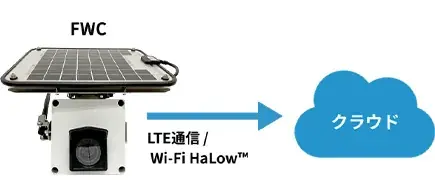 | FWC 主な特徴 | 超低電力(小型ソーラーパネル+内蔵バッテリで7日以上稼働※5分間隔撮影)、超高感度(最低0.02lux)、約3kgの軽量設計、LTEクラウド遠隔監視対応 |