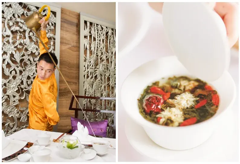 氷砂糖が時間経過で溶け出すなど、飲むごとに変化する味わいを楽しめる点が特徴で、四川料理との相性を考慮した演出となります。茶藝師は必要に応じて何杯でも注ぎ足し、料理の間の口直しと余韻の調整を担当します。