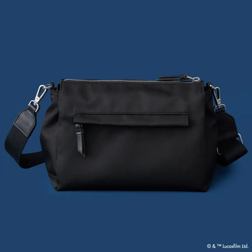 ショルダーバッグはブラックとベージュの2色展開です。ボディカラーによって雰囲気が変わるため、用途やコーディネートに合わせて選べます。正面には、グローグーがポッドで眠っているモチーフの刺繍があしらわれています。