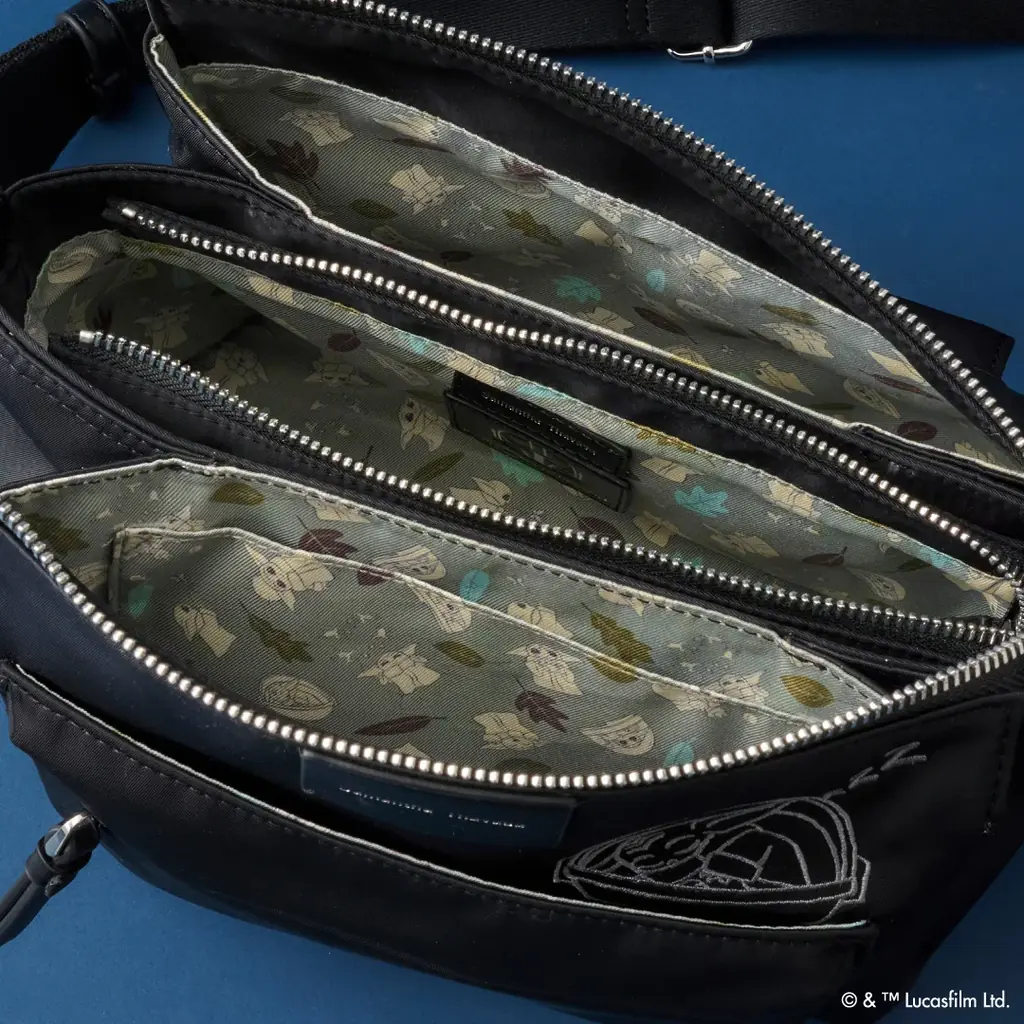 | ショルダーバッグ | 価格:29,700円。カラー:ブラック、ベージュ。正面刺繍(グローグーがポッドで眠るモチーフ)、背面ファスナーポケット、3層式内部、裏地はグローグー総柄 |