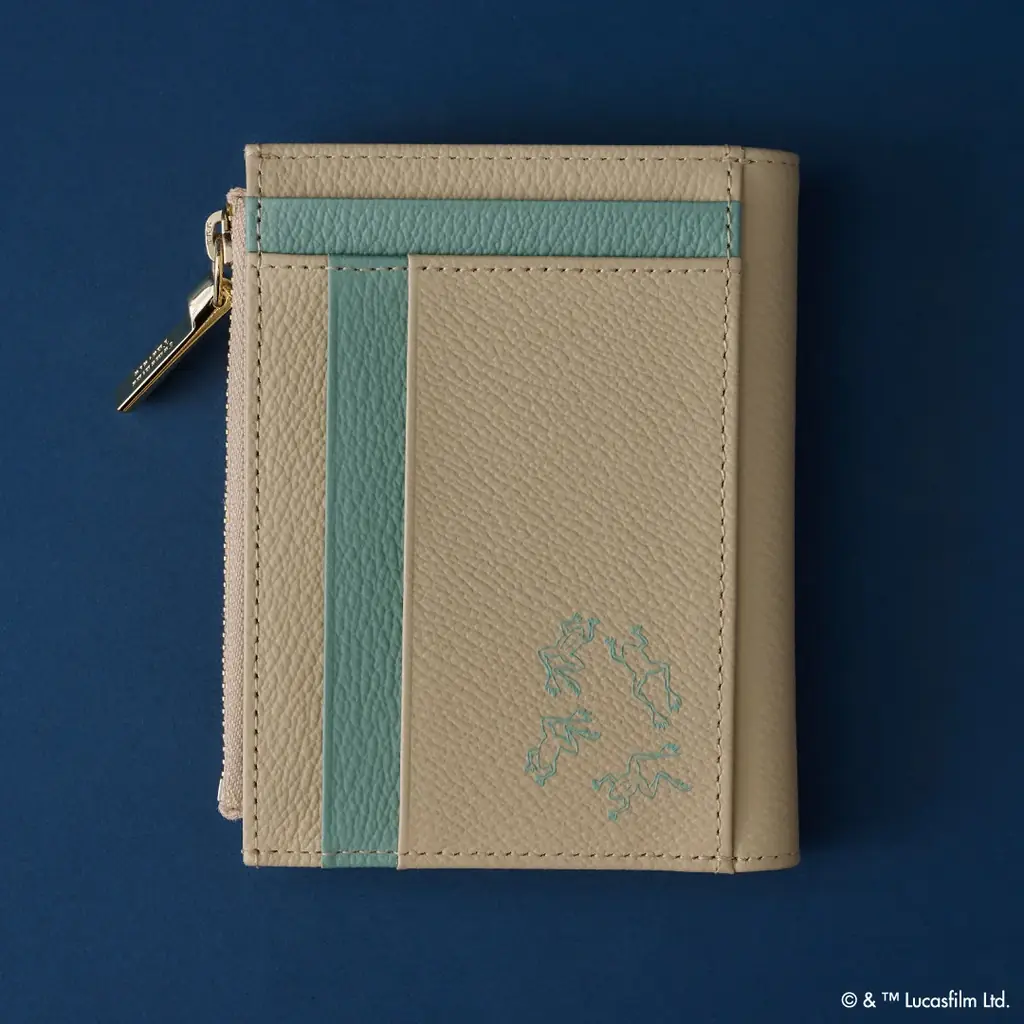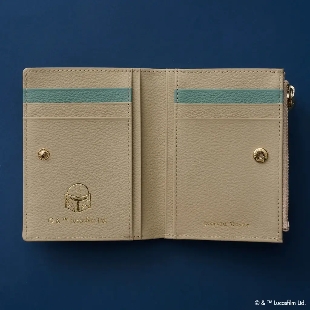 折財布は、正面にグローグーがポットを持って嬉しそうにしているアートがデザインされています。左下にはマンダロリアンのアートが箔押しで配されており、表面と内側で異なる演出を楽しめる仕様です。