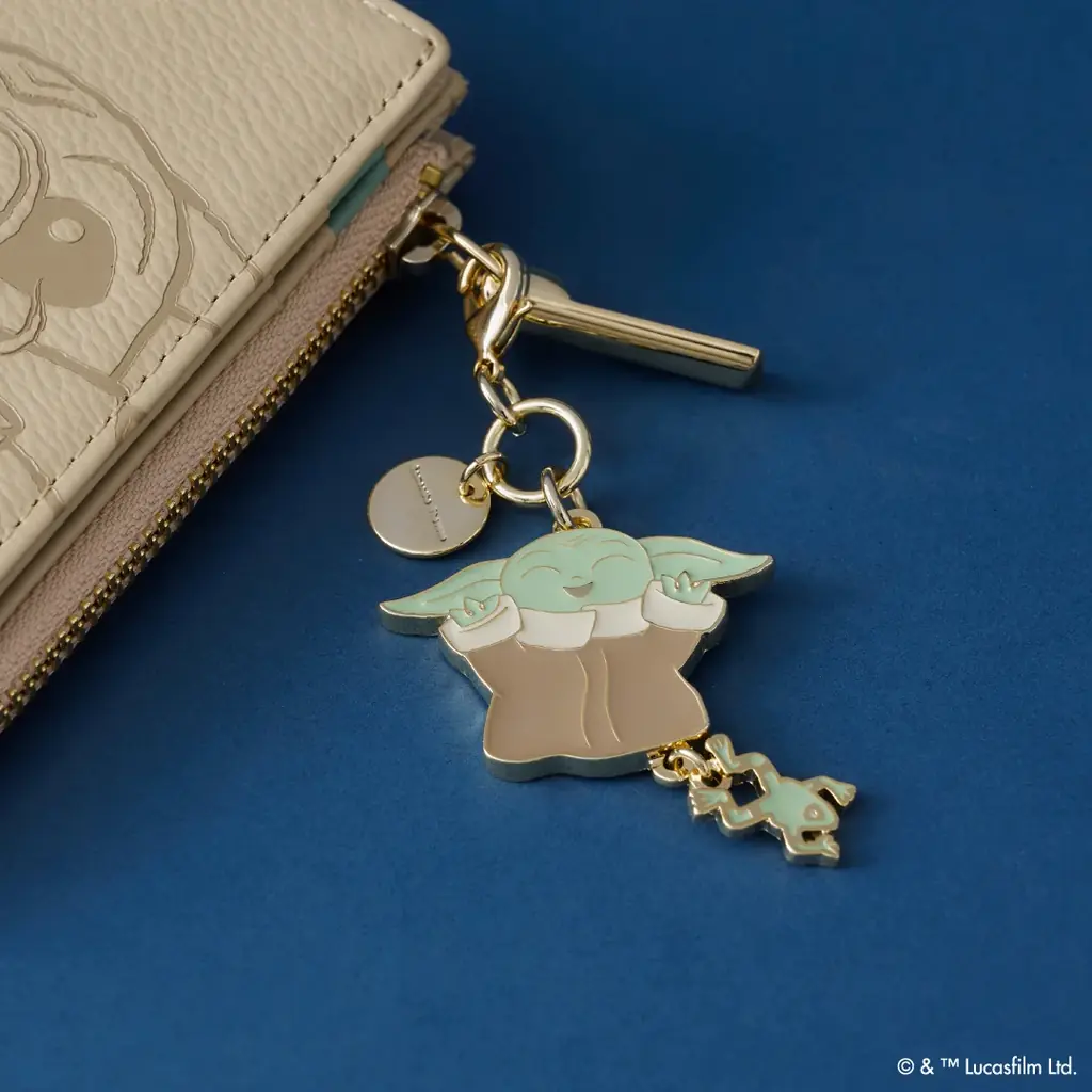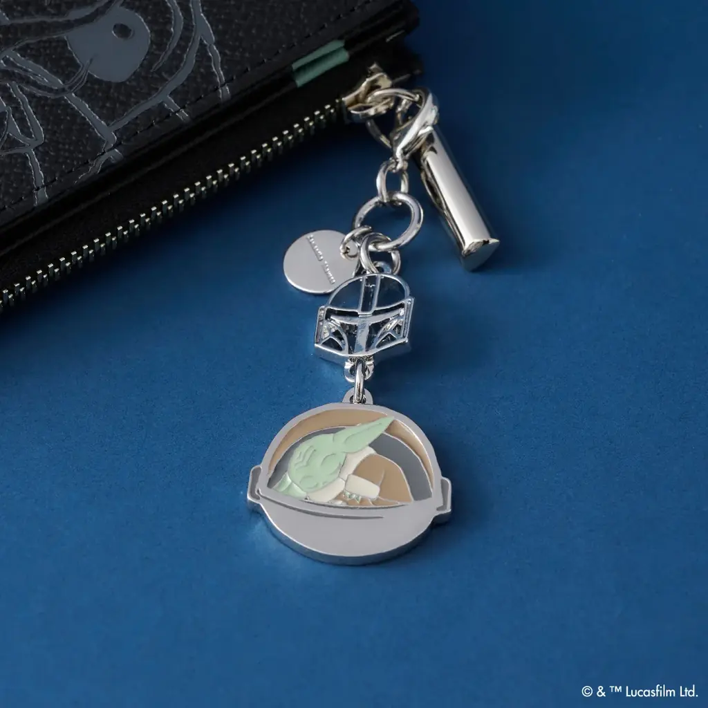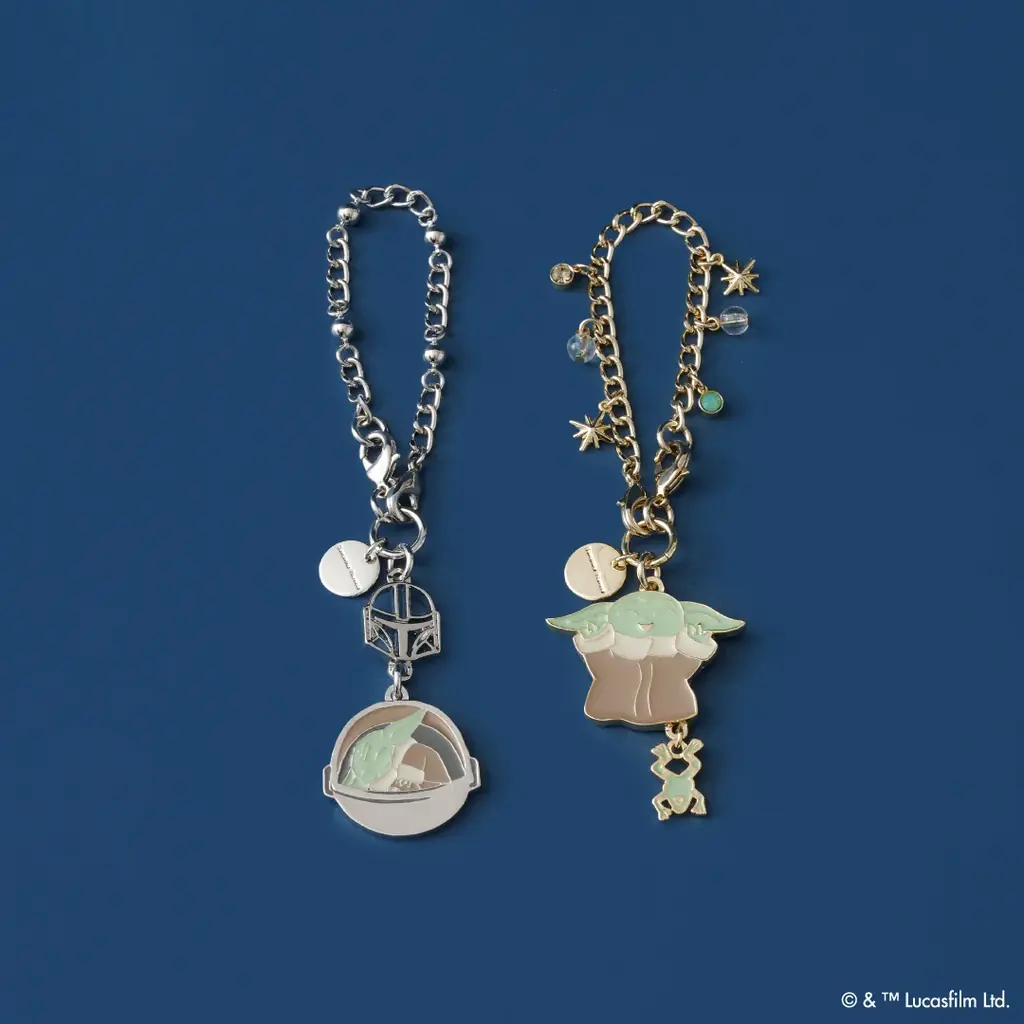 | バッグチャーム | 価格:各6,600円。2種展開(マンダロリアン+寝グローグー、喜ぶグローグー+ソーガン・フロッグ)、チェーンの色・デザインが異なる、チェーンを外してファスナーチャームとして利用可能 |