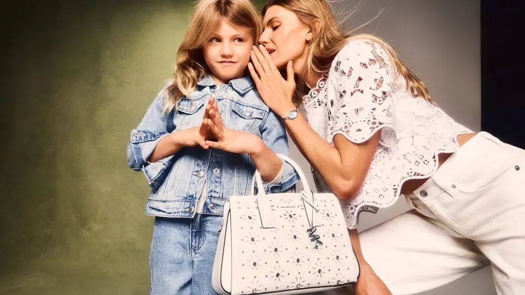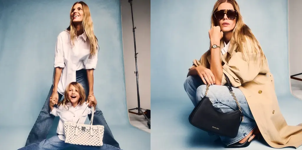 マイケル・コースはキャンペーンを通じて、母娘がともに楽しめるスタイル提案を行い、軽やかでシックな選択肢を提示しています。服装とバッグの組み合わせは、オン・オフの切り替えが求められる現代の母親像を想定した内容になっています。