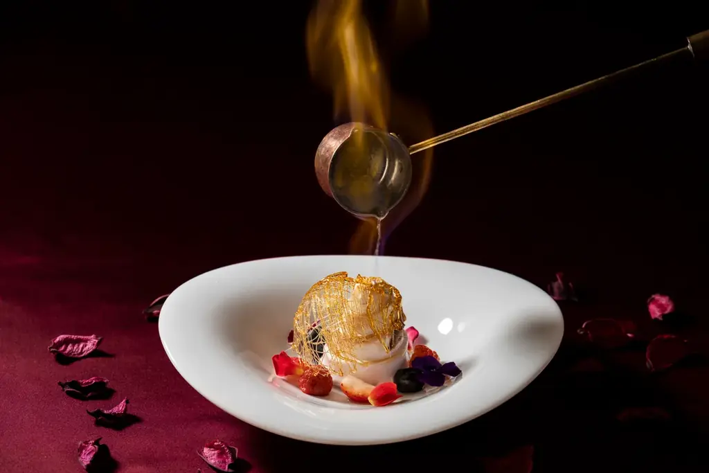 仕上げにはオレンジリキュールを用い、スタッフが目の前でフランベを行うことで立ち上る芳醇な香りを演出します。トロピカルな素材の味わいと炎のパフォーマンスが一体となることで、ディナーの締めくくりにふさわしい特別な時間を提供することが狙いです。