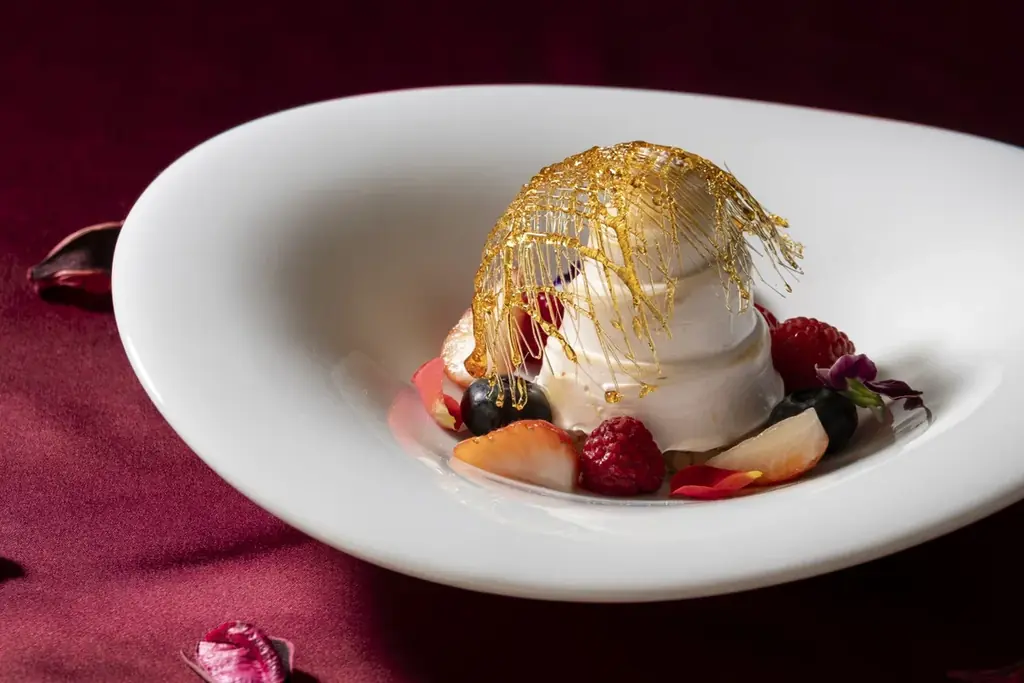 スペシャルディナースイーツは、南国素材を活かした華やかな一皿です。内部には濃厚な甘みのマンゴーアイス、食感のアクセントとなるココナッツクッキー、そしてふんわりとした口どけのメレンゲを組み合わせています。