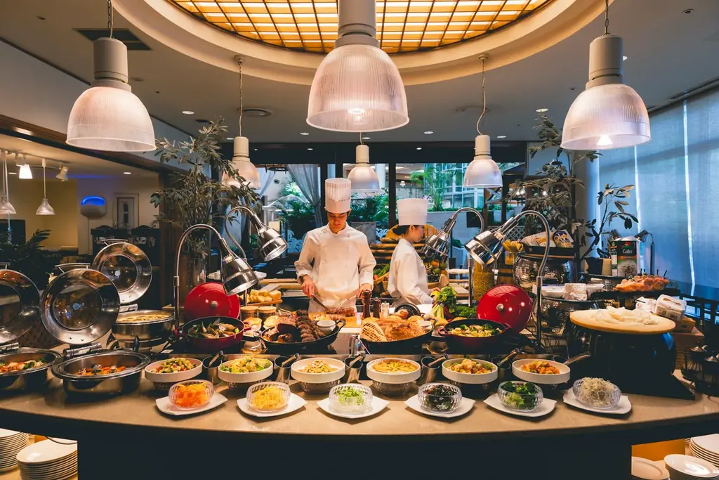 そのほか、3種のチーズを組み合わせて好みの風味に仕上げられるパスタコーナー、人気のタイカレー等を揃えたカレーコーナー、彩り豊かな前菜や欧風料理、子ども向けのキッズコーナーなど、世代を問わず楽しめるメニュー配置となっています。ライブキッチンカウンターでは調理の様子を見ながら出来立てを受け取れます。