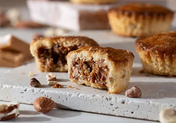 - 税込1,620円。サクッとほろほろとしたガレット生地にヘーゼルナッツを使用し、ナッツの旨みとキャラメルの甘味が調和する焼き菓子。販売時間は午前10時、午後1時、午後3時30分の1日3回です。