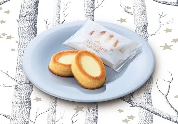 - ティグレス ノースホワイト(化粧箱小・6個) 税込2,160円:北海道産生クリームを練り込んだホワイトチョコレート生地を焼き、ホワイトチョコレートソースを流し込んだ製品です。長く愛される味わいの北海道限定品です。