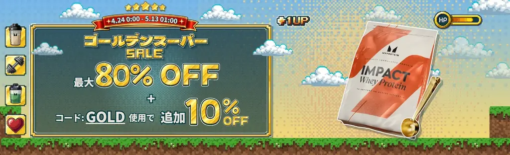 英国発、ヨーロッパを中心に世界70カ国で展開するスポーツ栄養ブランド「マイプロテイン」(THG Nutrition Limited)は、2026年4月24日(金)0:00から5月13日(水)1:00まで、公式サイトにて上半期最大級のセール『ゴールデンスーパーSALE』を実施します。対象商品はプロテイン、サプリメント、フィットネスウェアなど幅広く、最大で80%OFFとなる割引が適用されます。