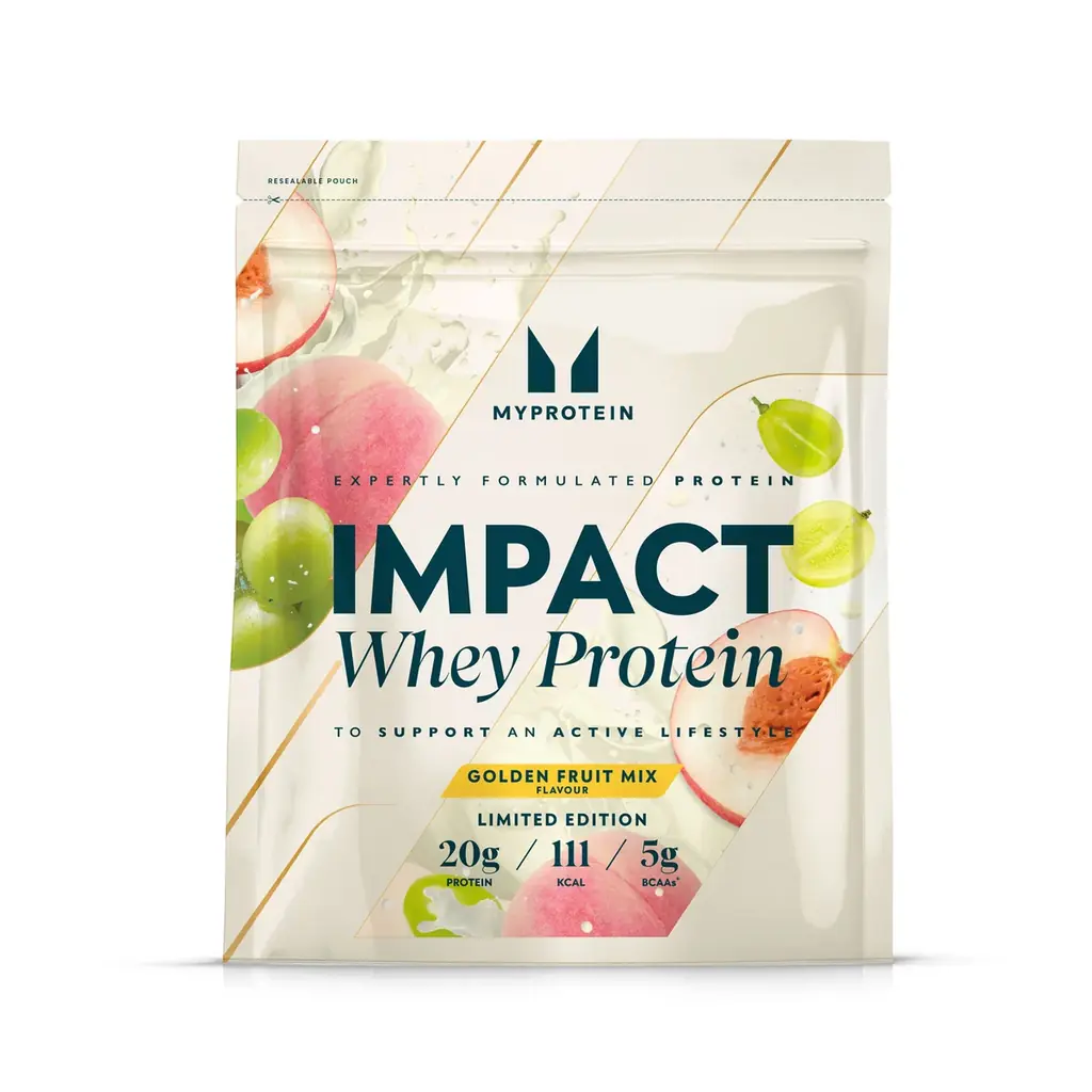 Impact ホエイ プロテイン ゴールデンフルーツミックスは、ピーチの甘みと白ぶどうの爽やかさを組み合わせたフルーティーな限定フレーバーです。1食分(30g)あたりたんぱく質20gを含有しています。容量は1kgと250gの2種類で、価格はそれぞれ7,975円/3,225円です。