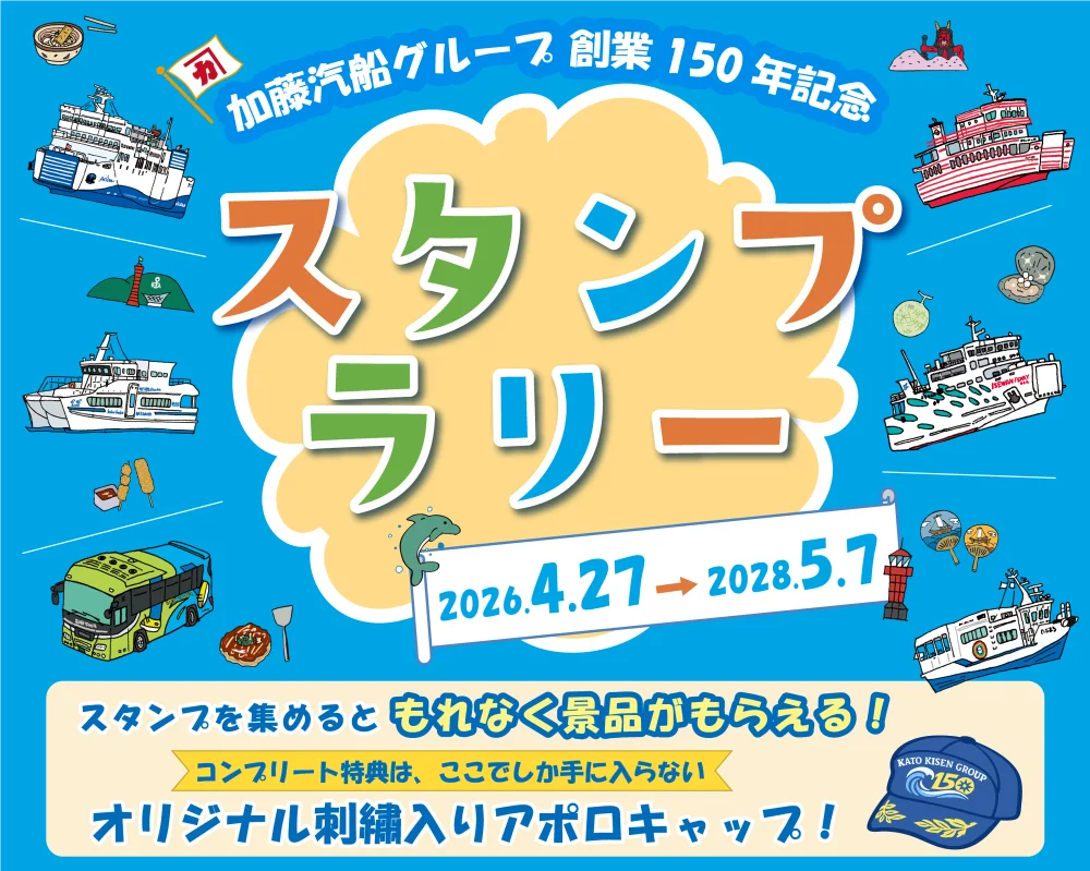 創業150年記念企画の第一弾として、2026年4月27日より「加藤汽船グループ150年記念スタンプラリー」が開始されます。本イベントは、グループが運航・管理する船舶やバスを巡りながらスタンプを集める参加型の企画です。