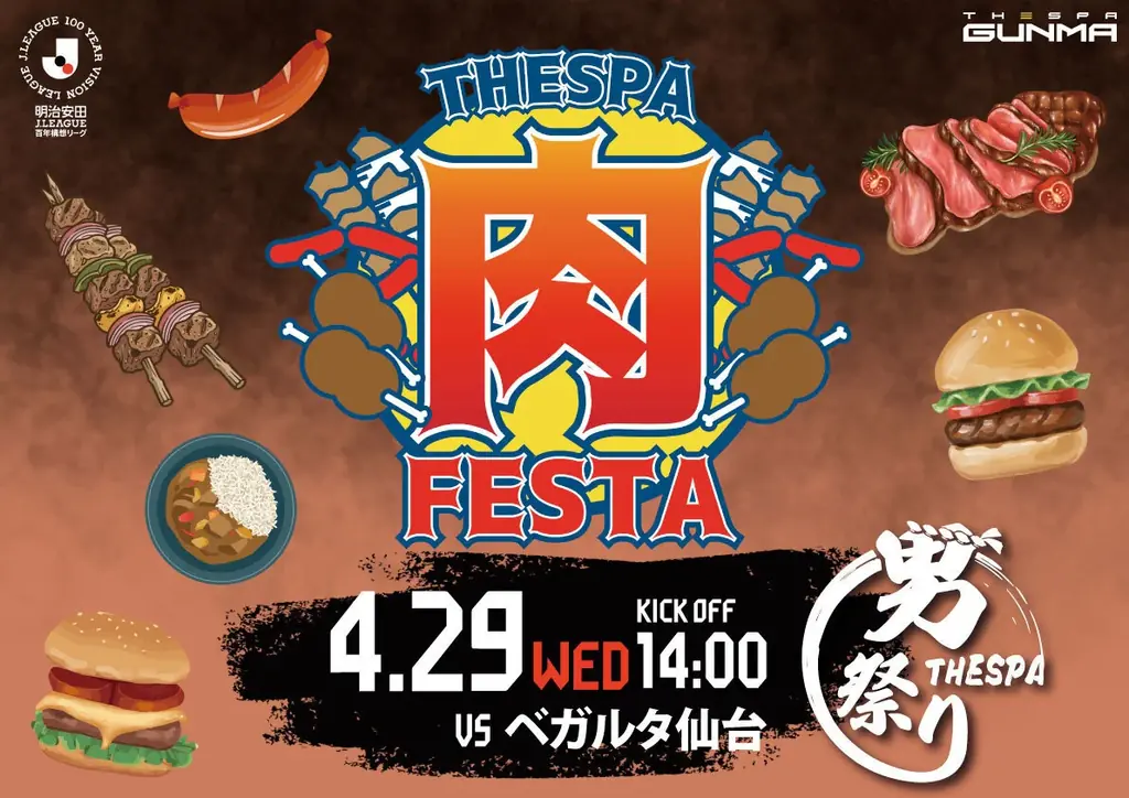 食をテーマにした企画として『THESPA肉FESTA』がザスパ横丁で実施される。4月29日に肉を中心としたメニューが提供される形式で、参加店舗や商品詳細はクラブ公式の案内ページにて公開されている。詳細は次のリンクから確認できる:https://thespa.co.jp/news/202604211523
