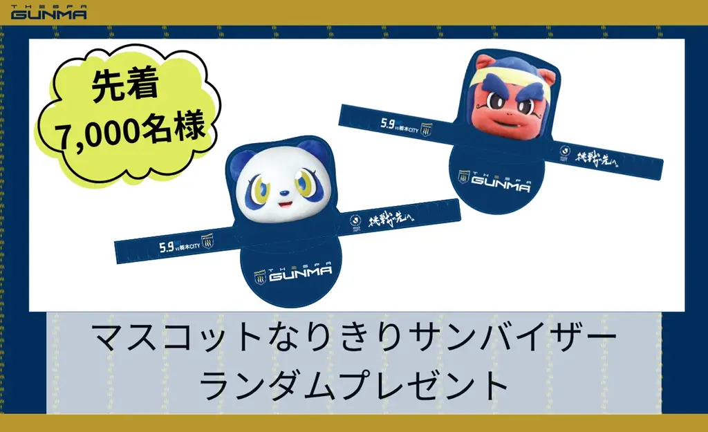 当日の来場者プレゼントについては、先着7,000名に『マスコットなりきりサンバイザー』を配布すると発表されています。サンバイザーの種類はクラブマスコットである「湯友」と「ザスパンダ」の2種類です。