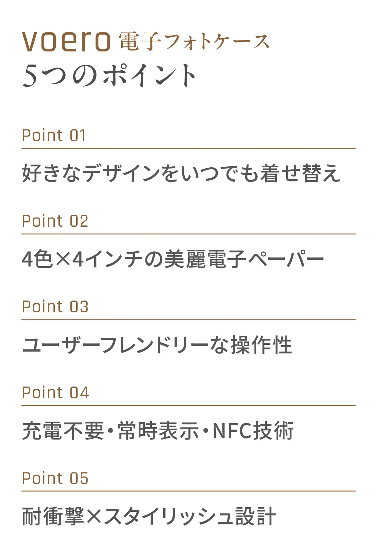 ここまでに記載したVoeroの主要な仕様とプロジェクト情報を整理します。電子ペーパーを背面に内蔵し、NFCで画像を転送、表示は電力を消費せず維持される点が最大のセールスポイントです。専用アプリ「NETME」を介した直感的な操作、保護性能を兼ね備えた二重素材構造、Makuakeにおける期間限定の先行予約販売と限定リターンがプロジェクトの構成要素となっています。