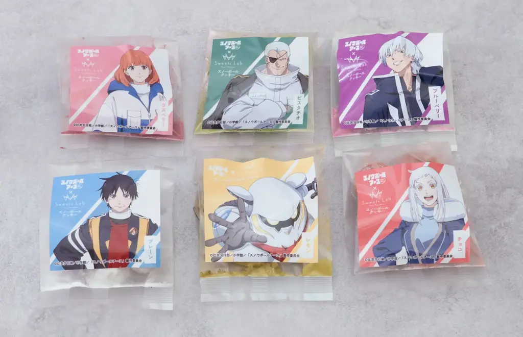 Sweets Labからは、作品名を冠した「スノーボール」を6種類用意。プレーン、レモン、チョコ、ラズベリー、ブルーベリー、ピスタチオのラインナップで、作品の世界観を想起させる丸い形状と風味設計が特長です。
