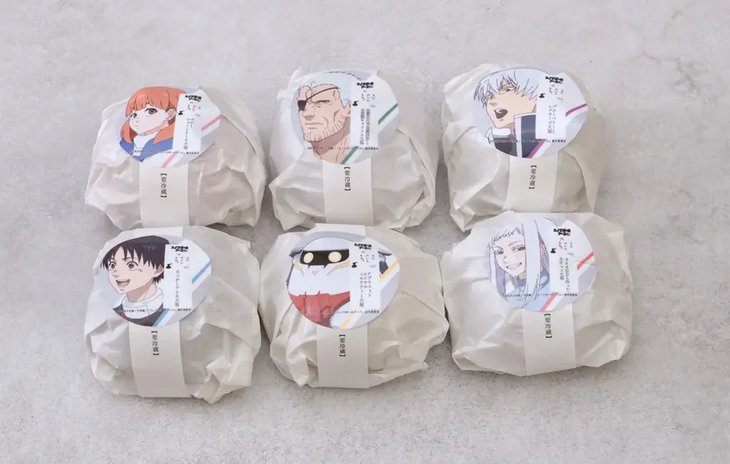 和菓子ブランド「えにかいたもち」からは、作品をモチーフにした丸い大福6種を提供します。ラインナップはなつかしラムネ大福、アプリコットロイヤルミルクティー大福、カカオ豆から作った生チョコ大福、ベリーショートケーキ大福、ブルーベリーとレアチーズ大福、京都北川半兵衛抹茶と自家製キャラメル大福です。