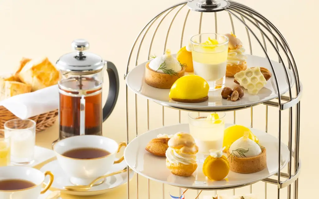 本館1階のロビーラウンジミザールでは、リニューアルしたアフタヌーンティーセットを5月中に提供します。月替わりの紅茶を含むフリーフロー(おかわり自由の紅茶類)と合わせて、レモンイエローを基調としたスイーツが並びます。店内は広々として明るく、ゆったりとしたティータイムを過ごすための設定です。