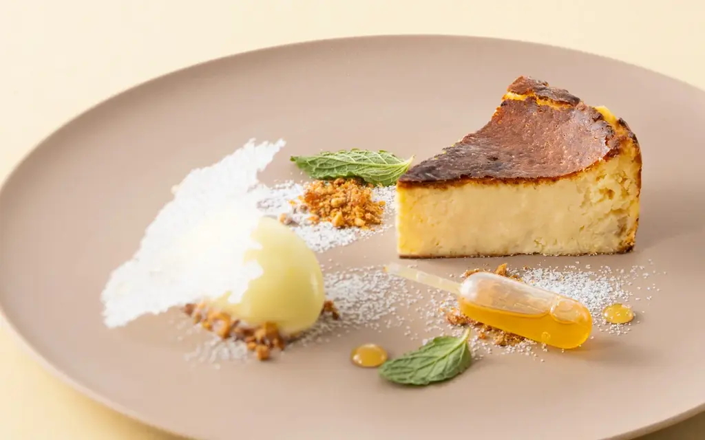 バスクチーズケーキにレモンのソルベを添えることで酸味が加わり、蜂蜜の風味との相互作用で味に深みが出る構成が採られています。提供時間は14:30〜16:00(L.O.)となっています。
