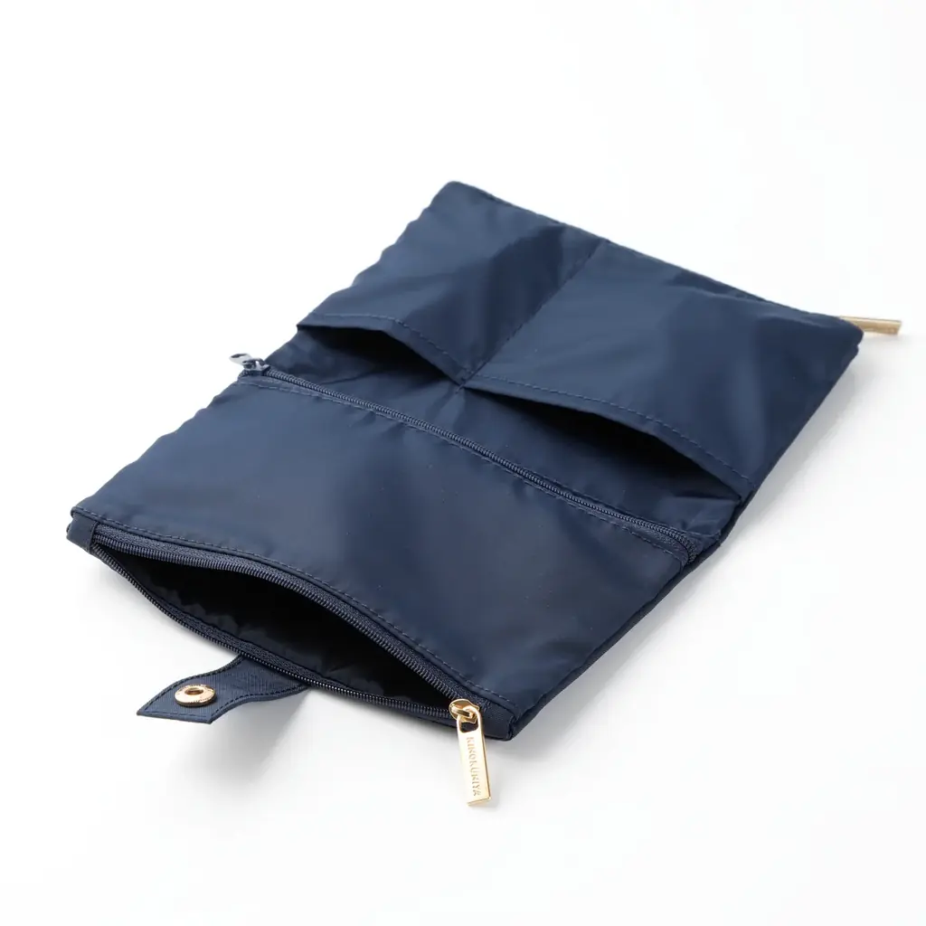 セットは3連ポケットタイプのポーチと、二つ折りタイプのポーチの組み合わせです。3連ポケットのポーチは細かなアイテムをサイズごとに仕分けでき、二つ折りのポーチはパスポートや小さめの手帳が収まるコンパクトさがポイントです。