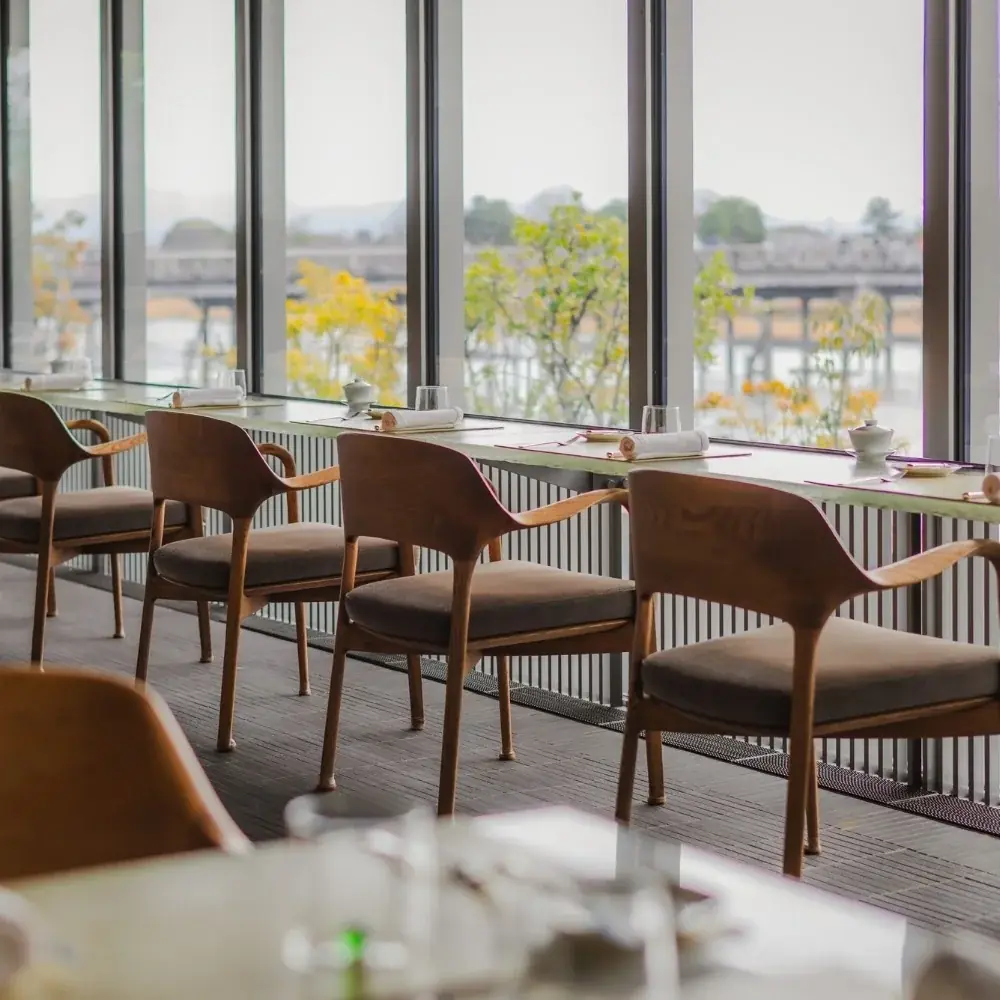 Riverside Café MUNIは、渡月橋と桂川を望むロケーションにあり、窓からの自然光が差し込む開放的な空間で朝食、ランチ、アフタヌーンティー、ライトディナーまでオールデイで利用できます。カジュアルフレンチのタパスやバブルズドリンクも提供され、特別な日だけでなく日常使いのシーンにも対応する店舗です。