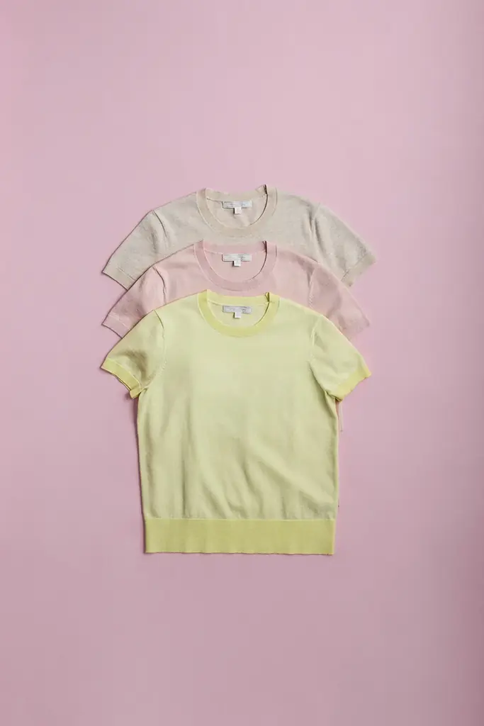| スーピマコットン クルーネック ショートスリーブセーター(およびカーディガン) | スーピマコットン100% | ベージュ、ピンク、ライム、ブルー | 16,500円(税込) |