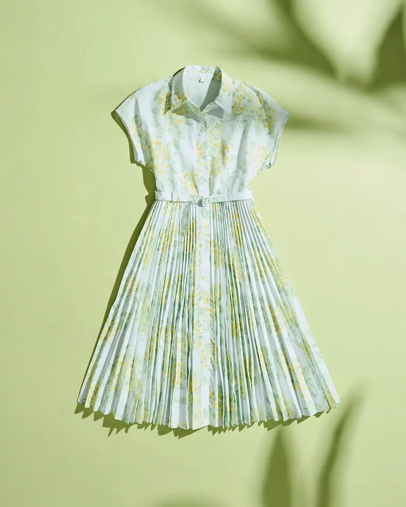 繊細なプリーツと水彩画のような草花のプリントが特徴で、歩くたびに表情が変わるドレッシーな一着です。肩先を覆うフレンチスリーブとウエストの共布ベルトにより、シルエットが整うため一枚で完成されたスタイリングが可能と説明されています。