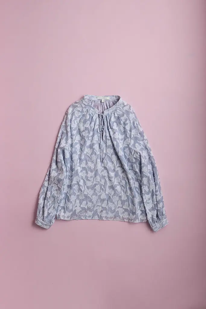 爽やかなストライプの上に花柄が浮かぶようなカットジャカードをあしらったブラウスです。首元のボウタイは結び方で表情を変えられる仕様となっており、フェミニンな装いからカジュアルなデニム合わせまで幅広く活用できます。