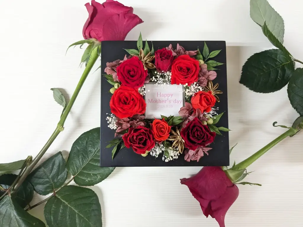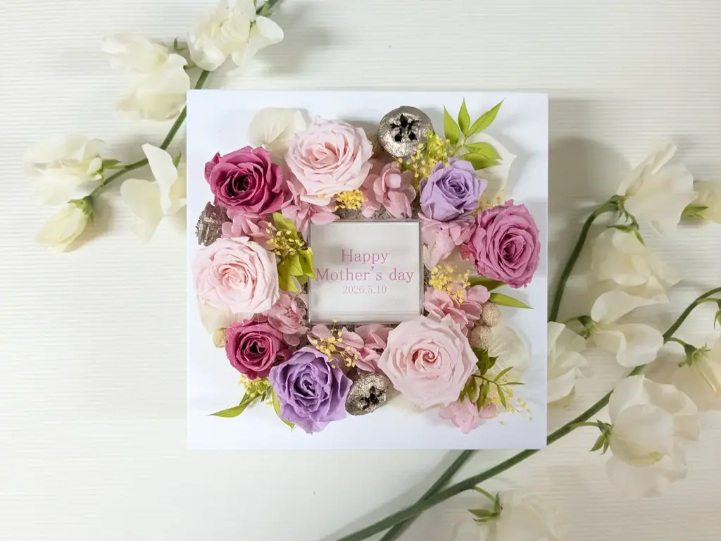プリザーブドフラワーの長期保存性と額装によるインテリア性を組み合わせることで、記念日としての印象をインテリアとして長く留めることができます。母の日ギフトとして贈ることで、日常に溶け込むかたちで「ありがとう」の気持ちを伝えられます。