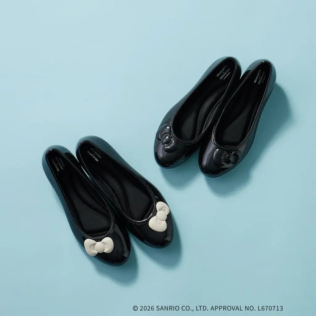 【ハローキティ】レインバレエシューズはリボンのモチーフがポイントのレインシューズで、モノトーンカラーにより大人でも取り入れやすいデザインに仕上げられています。価格は5,480円(税込)です。